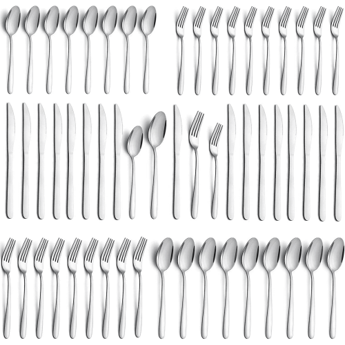 The good set of silverware can enhance the dining experience. If you are looking for a simple and classic cutlery set, then you have come to the right place! You won't regret taking this stainless steel flatware sets and serving food with them. The bestdin polish stainless steel flatware set will stand out in any tabletop setting! This attractive flatware set includes 8 dinner spoons, 8 dinner knives, 8 dinner forks, 8 salad forks, 8 teaspoons, and service for 8. The 40 pieces flatware set is great for everyday use. The sleek, classic lines of the design are so wonderful. This set can look laid back and cool with casual white plates. What we love about this refined collection is that it's dishwasher safe, so no pretense here. You can use it for special occasions and every day as well. It's absolutely a good silverware set to serve a family, entertaining guests or hosting a party, holiday meal, wedding, etc.This model is classic. It can be an accessory to any beautiful dinnerware that you have. Well-balanced and ergonomically designed. Every detail has been carefully polished, delicately designed, and produced. This promises to become your dinner plate's best companion!