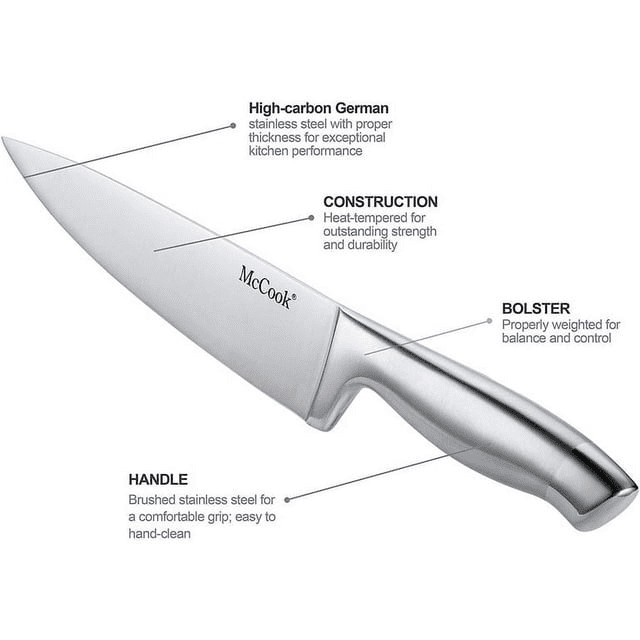 High-carbon stainless steel blades with serrated and straight edge for strength and durability, the knife features non-stick surface rust resistant and razor sharp. A sharp edge for effortless cutting, easy operation. A wide range of sharp blade shapes and gadgets to deal with a variety of food such as meat, vegetable, fruit, bread, fish as so on, it makes light work of cutting and brings the most amazing using experience to your cooking.