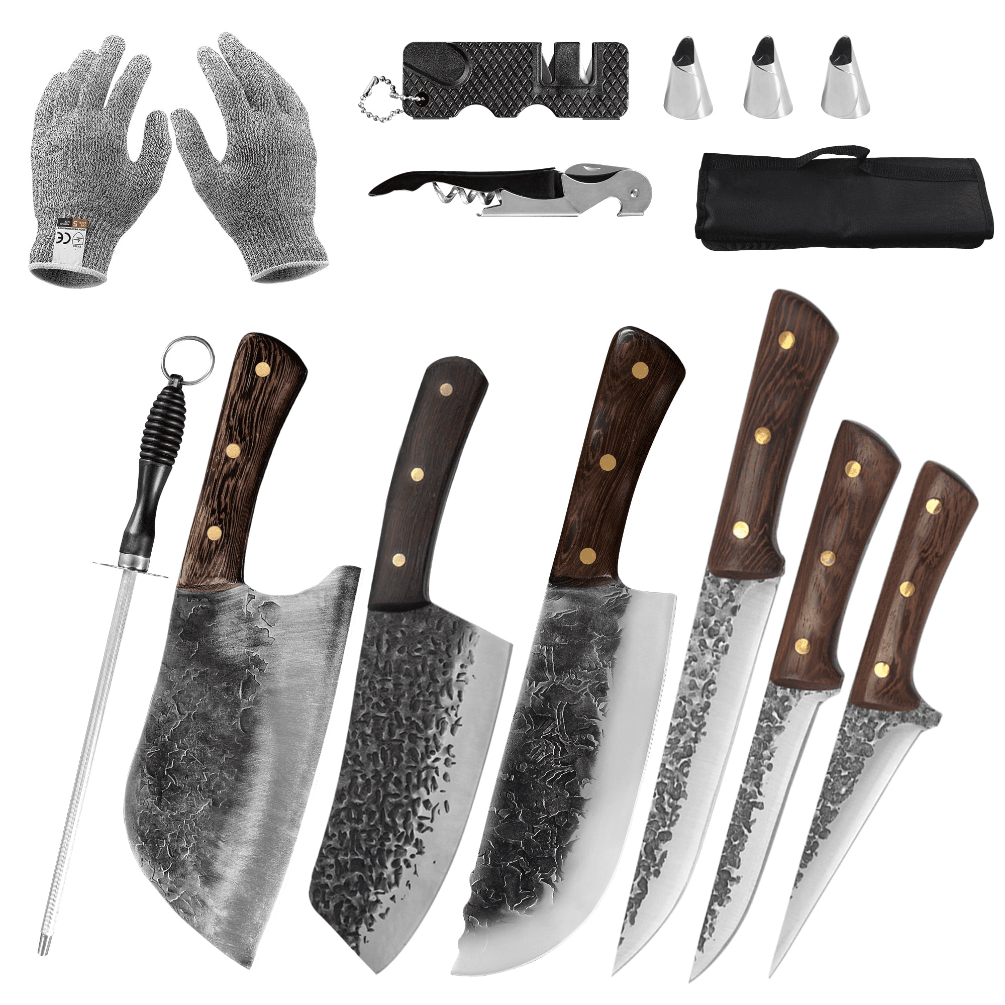 Package list:6pcs hammered pattern blade full tang handle butcher kitchen knife set, 3 stainless steel finger guards, 1 bottle opener, 1 pair of cut resistant gloves, 1 portable knife sharpener, 1 sharpening stick, 1 knife bag