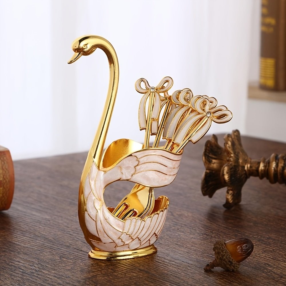 1pc Coffee Dessert Spoons Set; Swan Base Holder Coffee Spoons Set With 6 Forks Spoons Creative Metal Coffee Dessert Spoon Set For Coffee Dessert Ice C