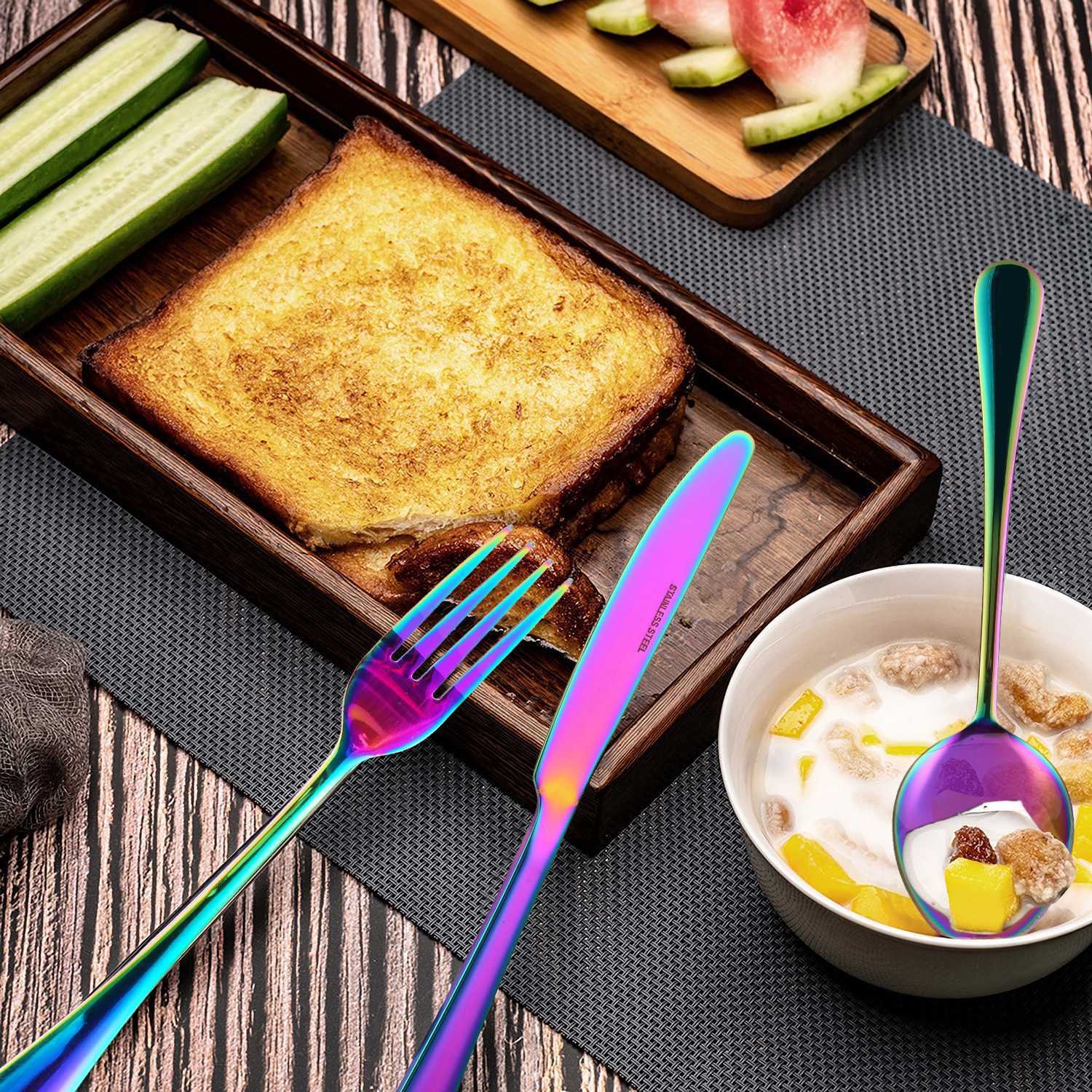 **FOOD-GRADE STAINLESS STEEL & DURABLE*:All our flatware set are made of food-grade stainless steel; BPA-Free and safe to eat with. Meanwhile; they can withstand even the most temperature intensive foods while maintaining their form and shape. Thanks to its outstanding quality; it will be your desirable and long lasting companion!