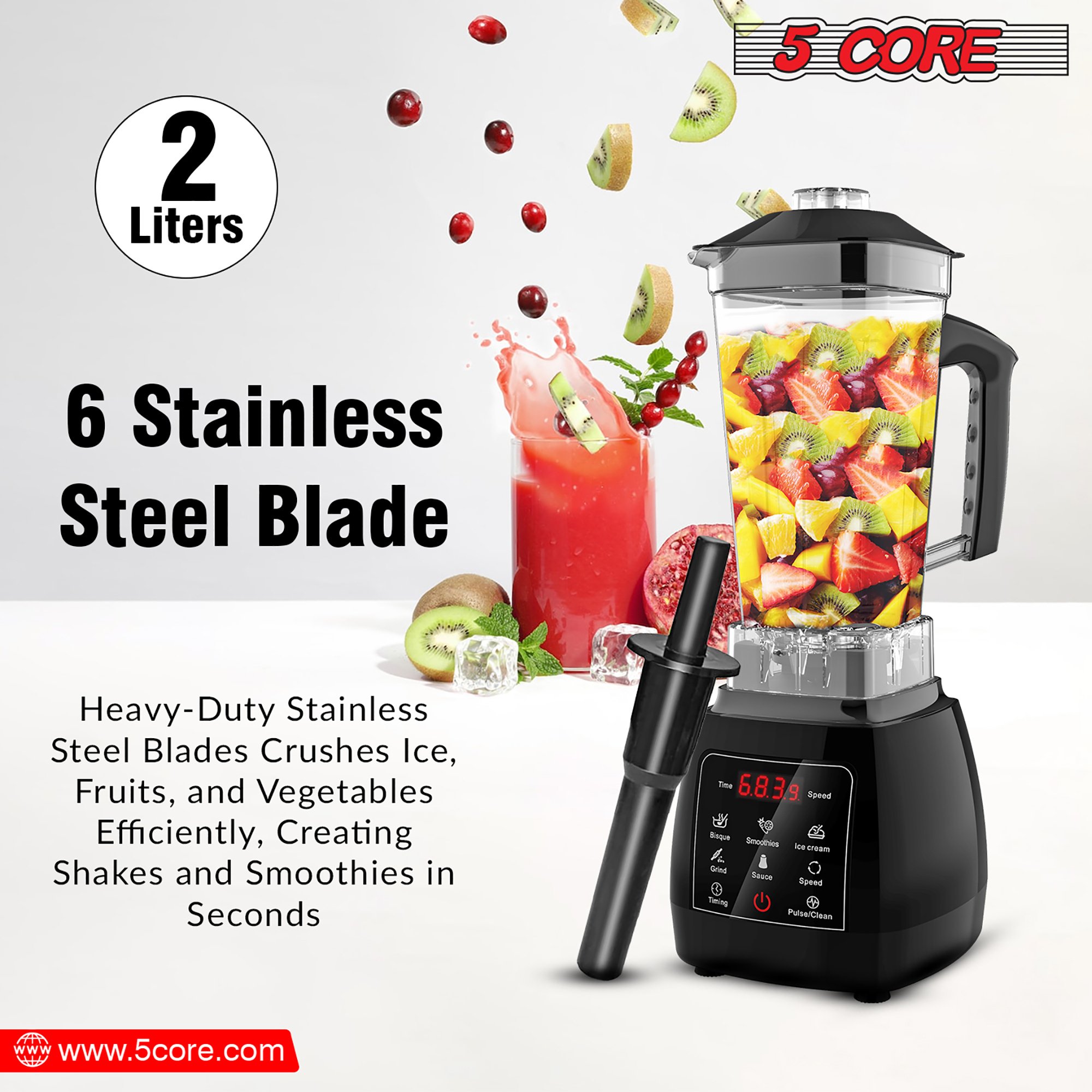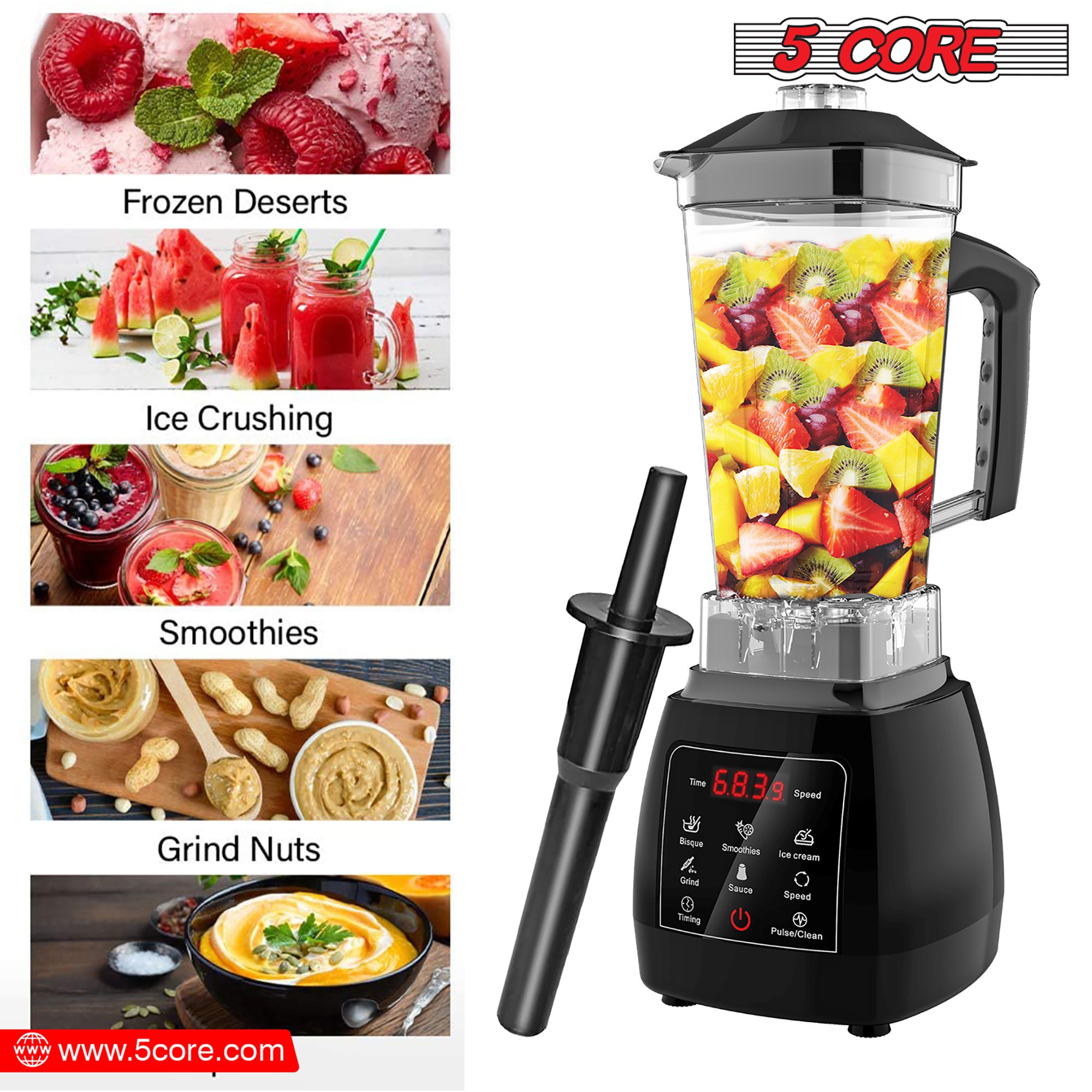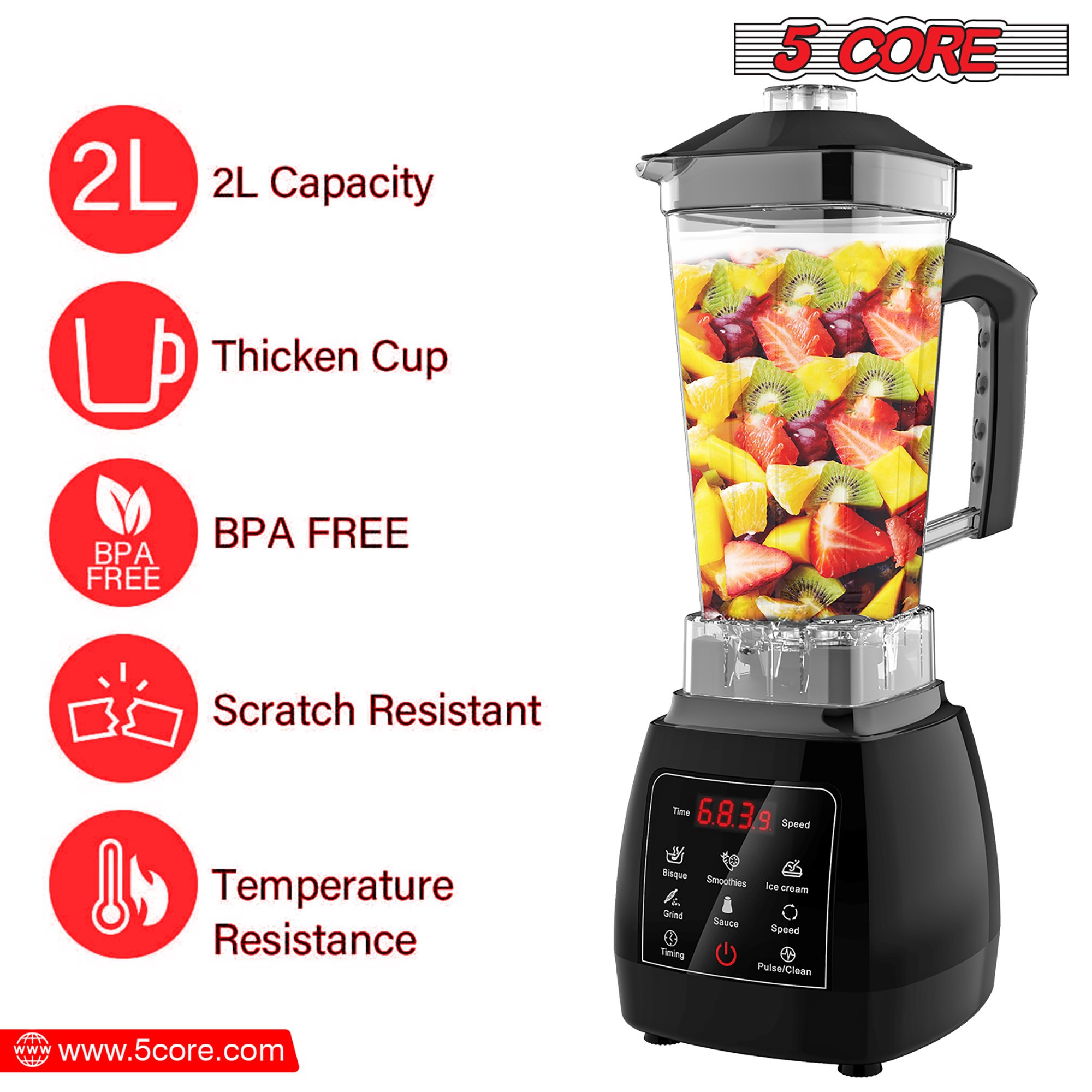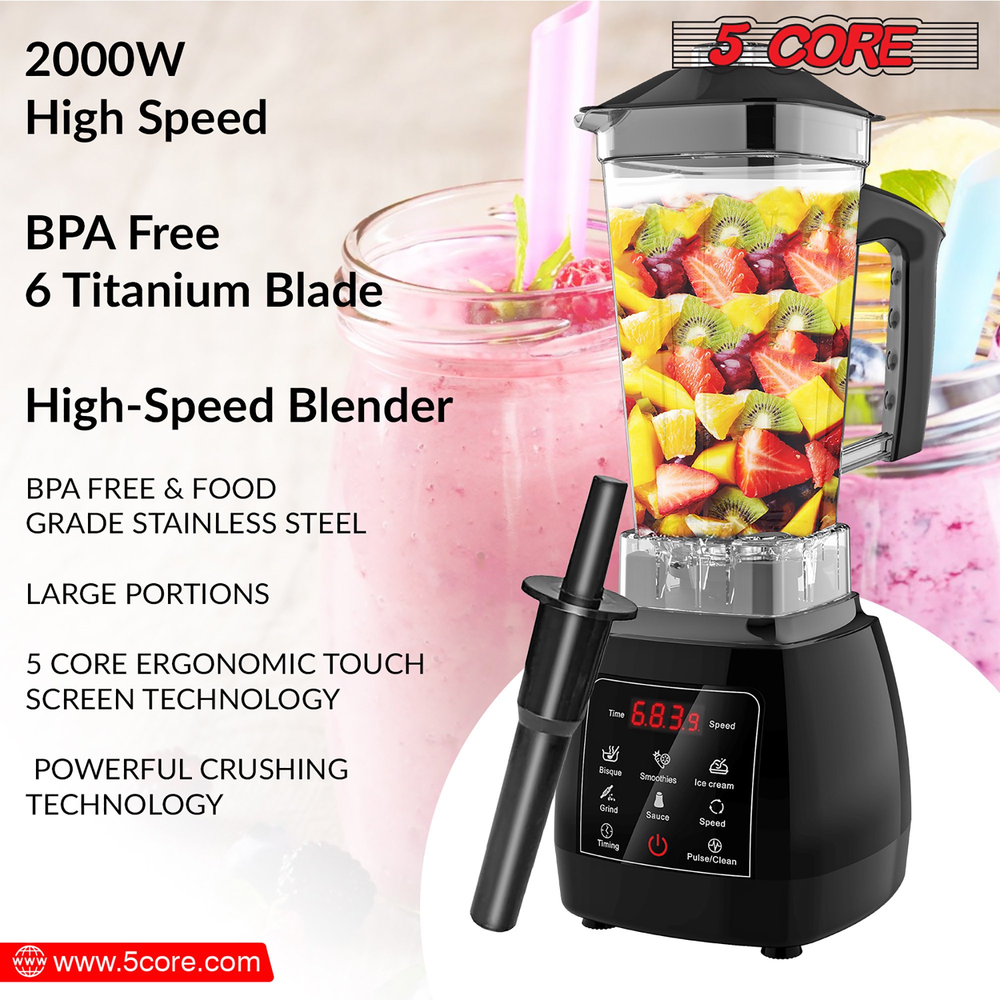 Take control of your blending experience with the blenders' Variable Speed, Pulse, and Timer. | The high-performance 2000W motor of the 5 Core smoothie blender is designed to handle tough ingredients like frozen fruit, heavy powder, and leafy green. | With laser-cut Titanium blades that are resistant to dulling or bending, this blender ensures consistent quality results from the first blend to the last. | Whether you want to blend smoothies, protein shakes, or soups, this blender lets you choose the ingredients to get the most out of every blend. |