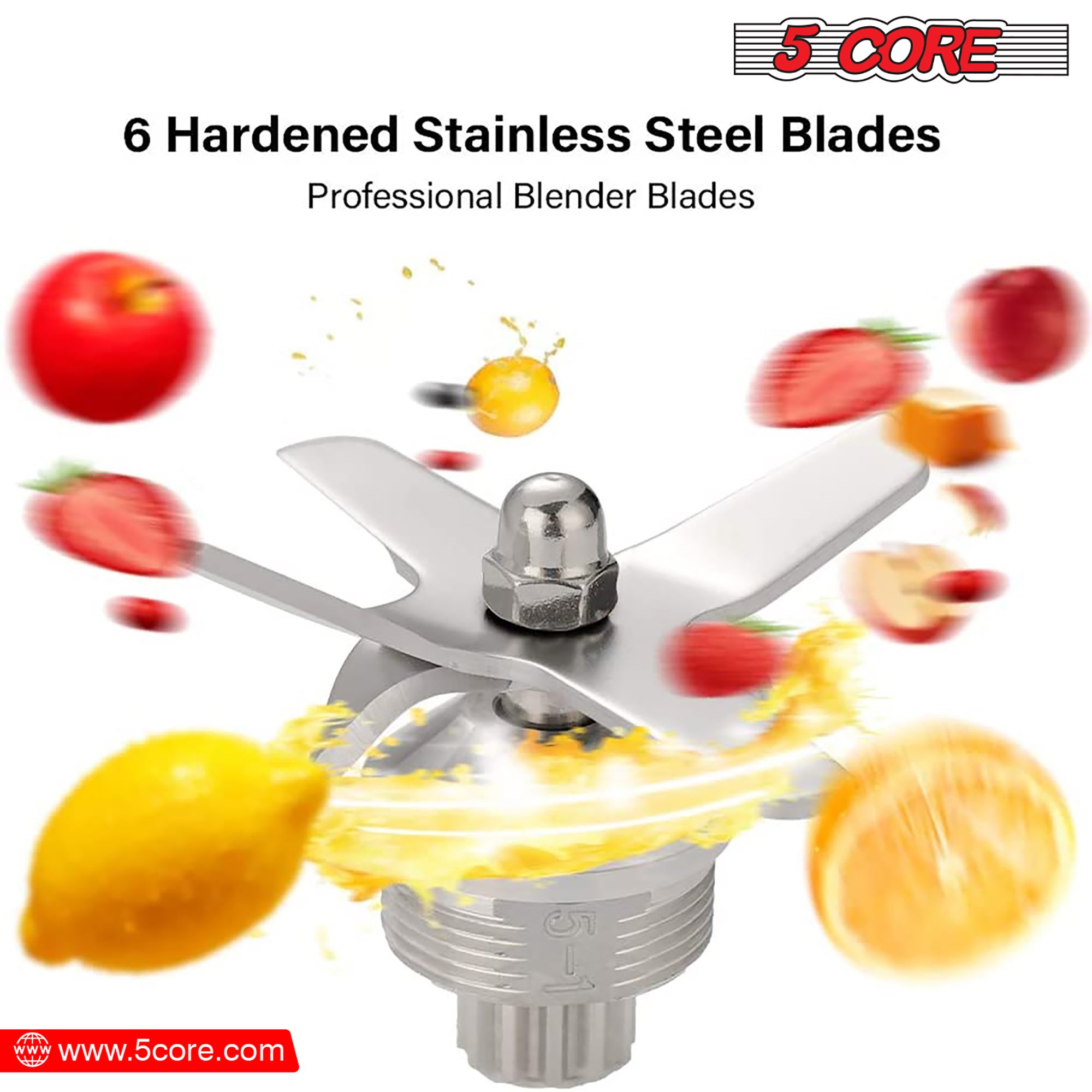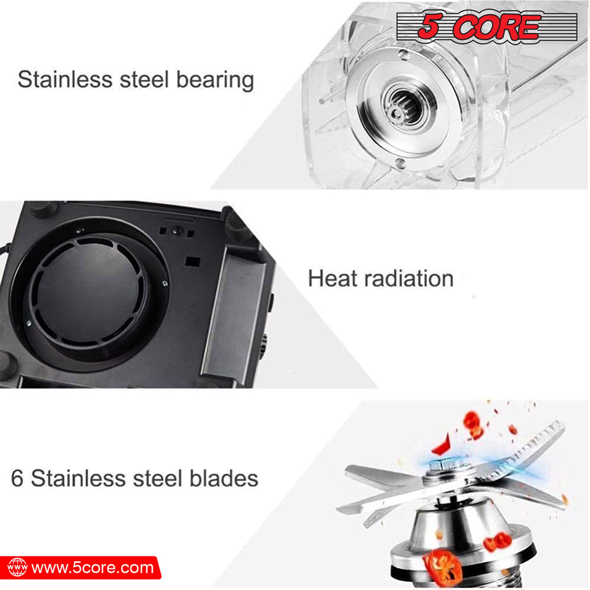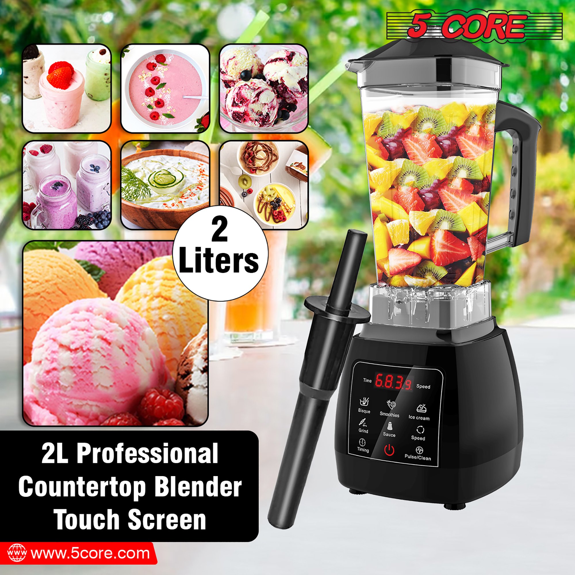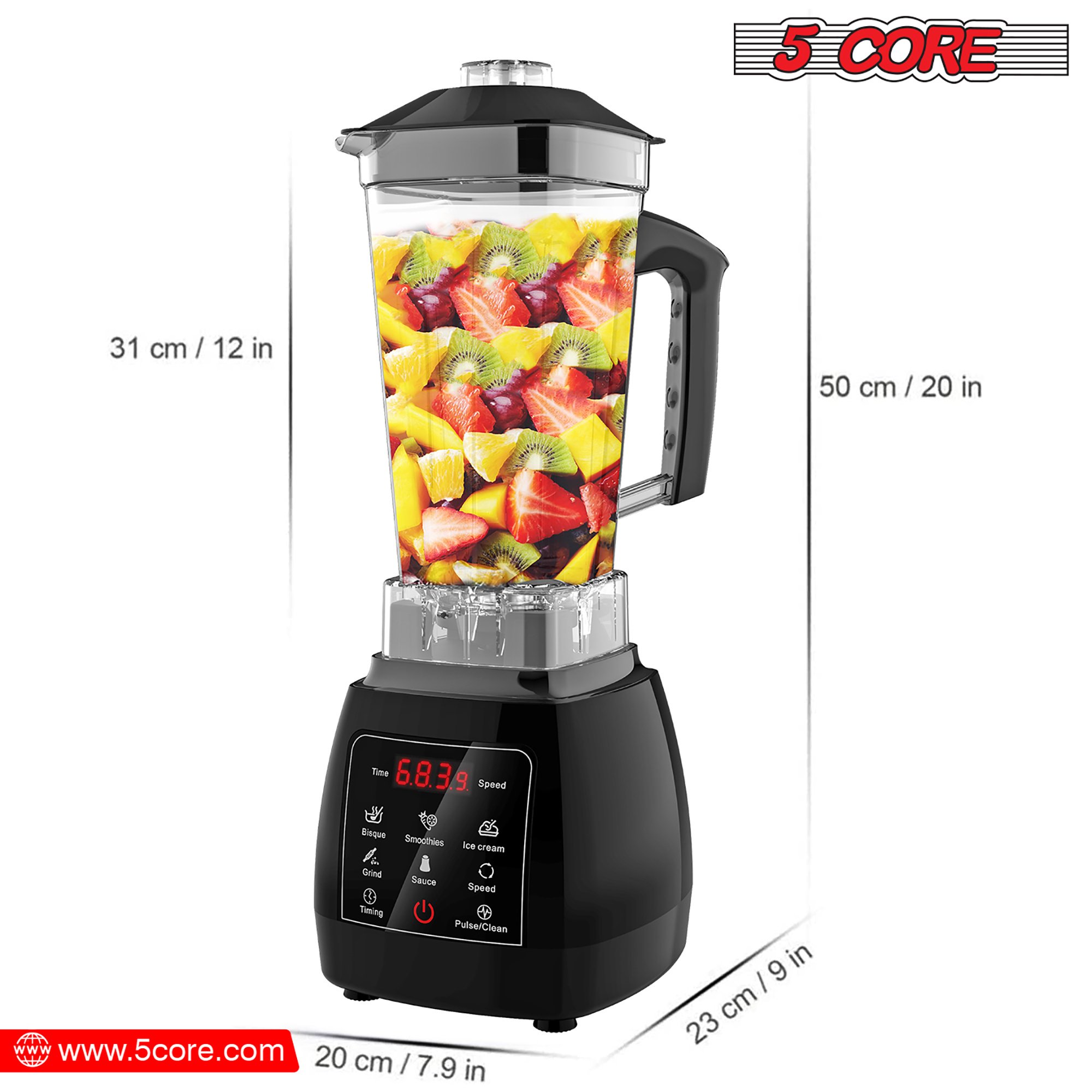 Take control of your blending experience with the blenders' Variable Speed, Pulse, and Timer. | The high-performance 2000W motor of the 5 Core smoothie blender is designed to handle tough ingredients like frozen fruit, heavy powder, and leafy green. | With laser-cut Titanium blades that are resistant to dulling or bending, this blender ensures consistent quality results from the first blend to the last. | Whether you want to blend smoothies, protein shakes, or soups, this blender lets you choose the ingredients to get the most out of every blend. |
