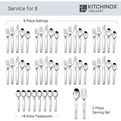 The kitchinox tableart chalet flatware collection provides the perfect framing to your everyday dishes or formal china. With its gentle, rounded angles, the chalet flatware collection evokes the sloping eaves and structural angles of a swiss chalet. Perfect for year-round daily use or formal dining. Each piece of the chalet flatware collection is made from the highest quality 18/0 stainless steel, fashioned and polished to a fine, smooth finish and perfectly balanced for easy handling. Heavyweight grade lends substance in addition to style to this place setting. Because you deserve the best, kitchinox is proud to offer the plusone quality guarantee. This guarantee represents our unrivaled commitment to the highest standards of craftsmanship in stainless steel tableware. You deserve the best with kitchinox tableware