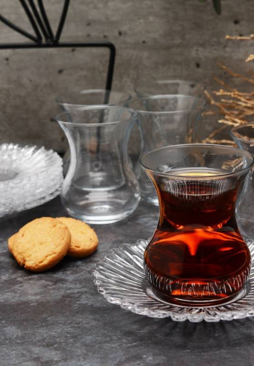 The Paşabahçe Aurora Tea Set is a comprehensive ensemble that includes 12 pieces, specifically designed to accommodate 6 persons. This set contains tea cups and plates.