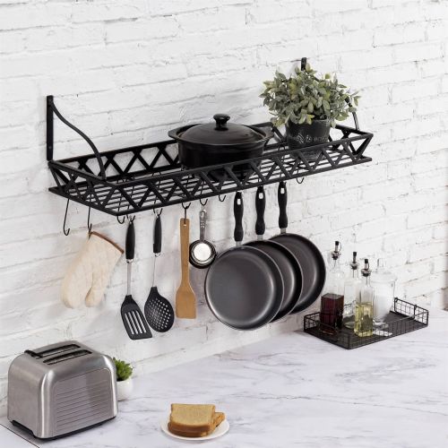 Organize your kitchen and prevent messes with this Black Metal Rectangular Wall Mounted Kitchen Pot Rack with 12 Hanging Hooks. Easy to mount to most wall surfaces with proper hardware, this organizer shelf is perfect for display anywhere in your kitchen or restaurant. Store your pots, pans, and other cookware items on the top shelf, and keep all of your utensils such as spatulas and ladles hanging from the 12 included hooks. You can access these kitchen accessories easily when you need them, it also can maximize the kitchen storage space and keep it neat.