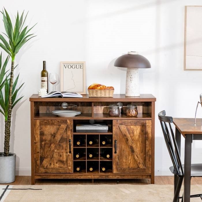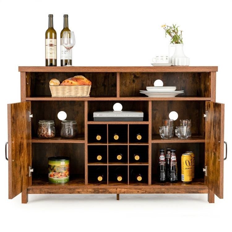 This Rustic Brown Detachable 9 Bottle Wine Rack Kitchen Buffet Storage Cabinet features a detachable 9-bottle wine rack that offers an ideal storage solution for your wine collection. Features ample storage space with 3 open compartments and 2 door cabinets for concealed storage. Shelves inside are adjustable in height, which help customize an ideal storage space for your private items. Made of durable engineered wood, the kitchen cupboard is sturdy and durable. The 4 legs are fitted with anti-skid pads to provide excellent stability. And the bottom is equipped with extra support plate to prevent the cabinet from shaking or wobbling.