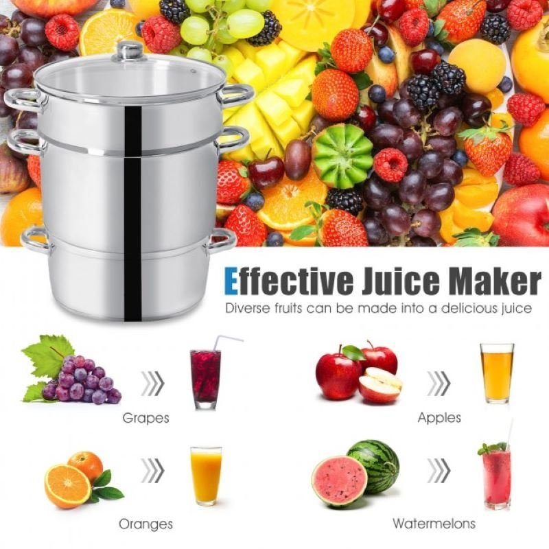 3.The stainless steel material features smooth surface and high temperature resistance. After use, this juicer steamer only needs to be washed in hot water with sponger and mild liquid detergent. It is also easy for you to use this steamer to make delicious and fresh juice.