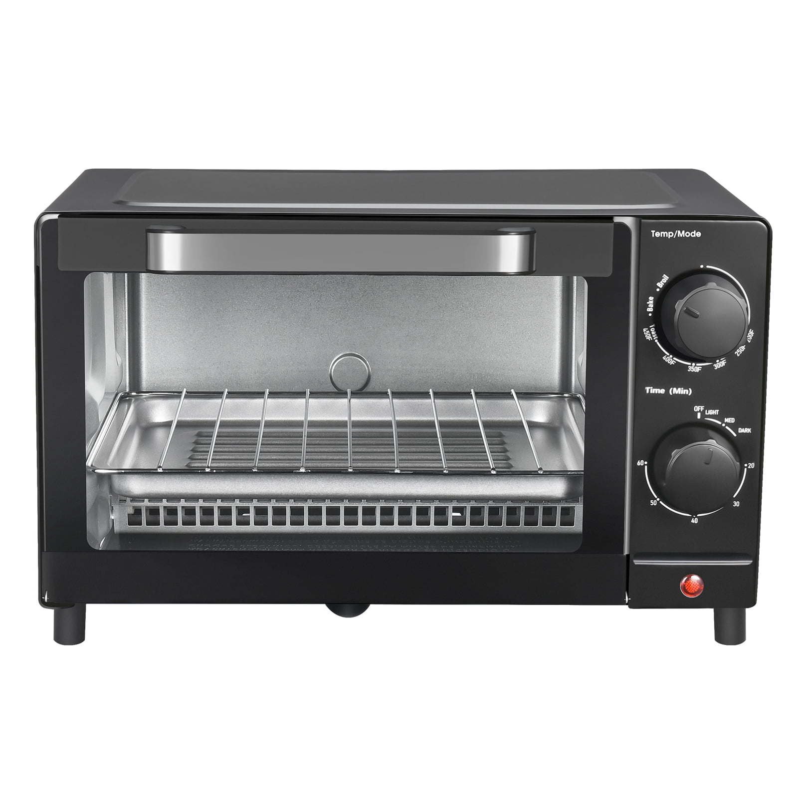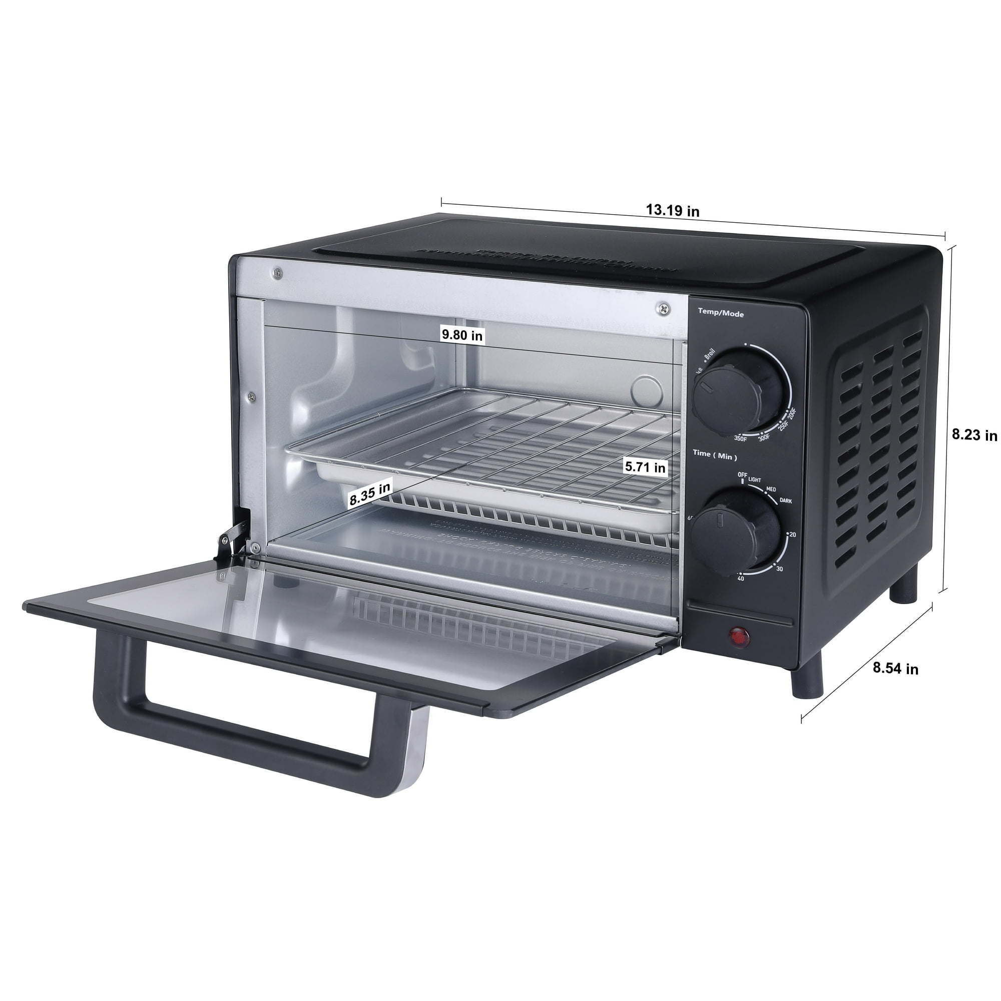 The Mainstays 4 slice Toaster Oven (MS54100112163) make your live more convenient and efficient. Perfect for preparing toast, sandwiches, pizza and much more. The Mainstays Toaster Oven can accommodate up to 4 slices of bread or a 9-inch pizza. The turn dial allows you to easily adjust the temperature mode and time settings. The compact size uses less energy and counter space and stores easily. Makes mealtime swift and smooth, especially in busy households. The sleek black finish will coordinate beautifully with existing kitchen decor and color palettes. Comes with baking rack and baking pan, simply wipe clean the oven exterior for quick and easy cleaning. Mainstays Toaster Oven is sure to become a staple in your home cooking and baking ventures, bring new experience in your daily life.