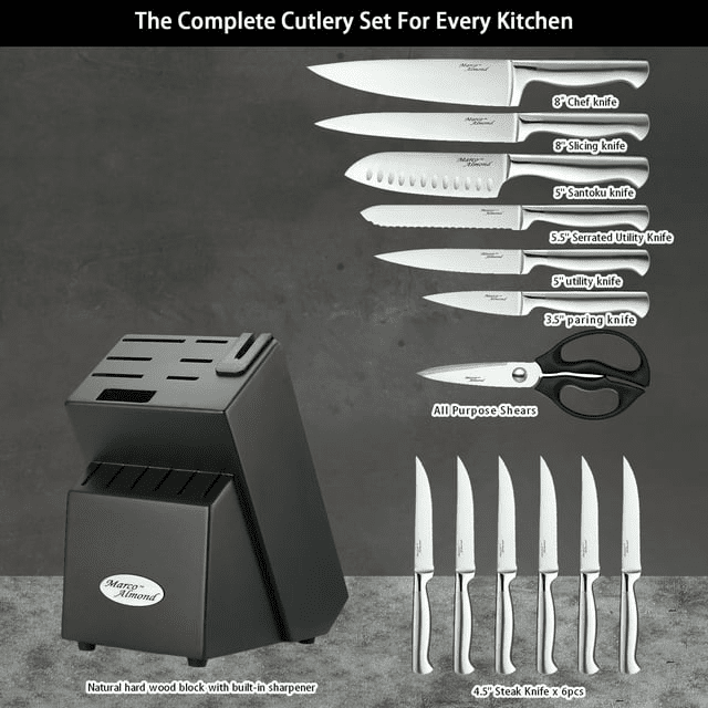 Everything looks tidy and clean in the smartly designed knife block. The hard wooden knife block, which takes less space, keeps all of the knives in the slots. The knife set makes your countertop look modern and fun, it comes with just about every piece you need for basic kitchen for cutting meat to veggies to the salad.