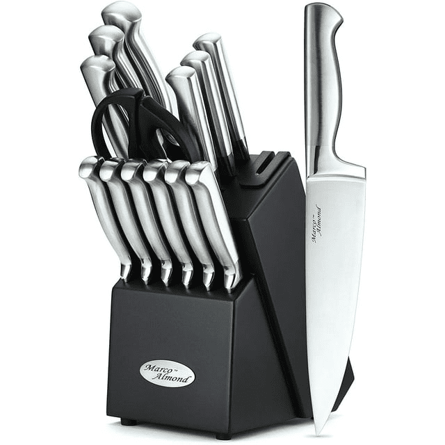 The knife block set contains 14 pieces of knives, scissors and block, a wide range of sharp blade shapes and gadgets to deal with a variety of food such as meat, vegetable, fruit, bread, fish as so on. The knife set makes light work of cutting and brings the most amazing using experience to your cooking.