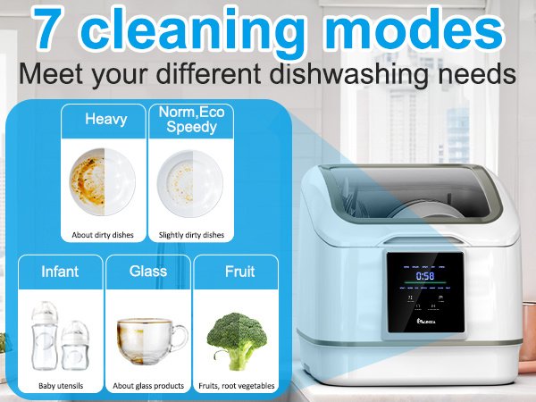 5.7 Wash Cycle Options: IAGREEA portable countertop dishwasher supports HEAVY, NORM, ECO, SPEEDY, INFANT, GLASS, and FRUIT modes for your various dishwashing needs. An extra STORE mode offers 72-hour ventilated storage to prevent odors and keep your dishes clean. In order to save energy, it is not turned on automatically. Please turn on the STORE mode by yourself when you need it.