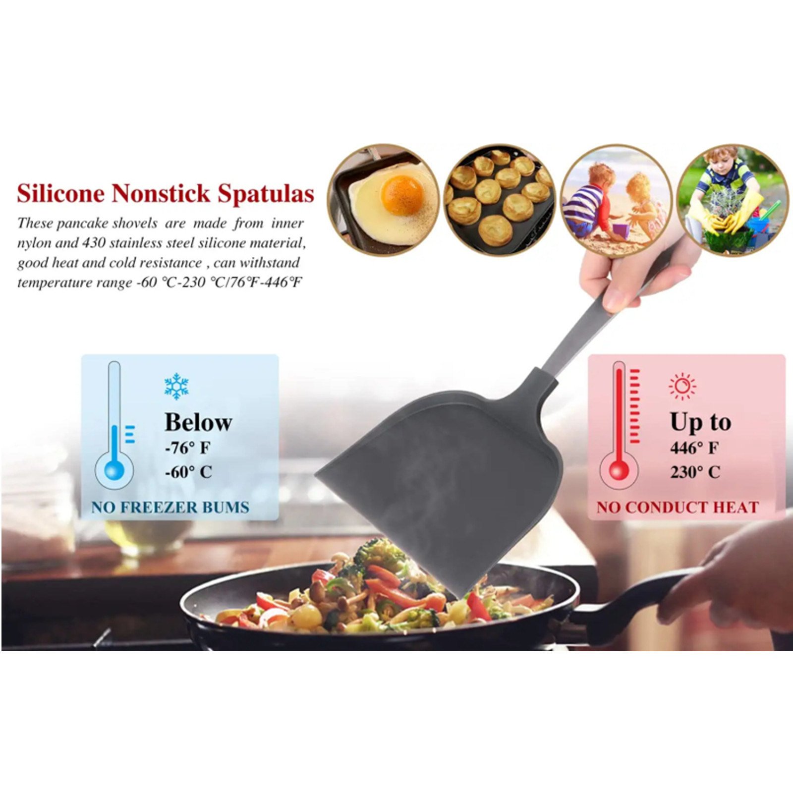 5.Flexible and soft spatula head is good to flip, stir, scrape and fold the most kinds of food without scratching your coated cookware,smooth edges especially suitable for non-stick pan