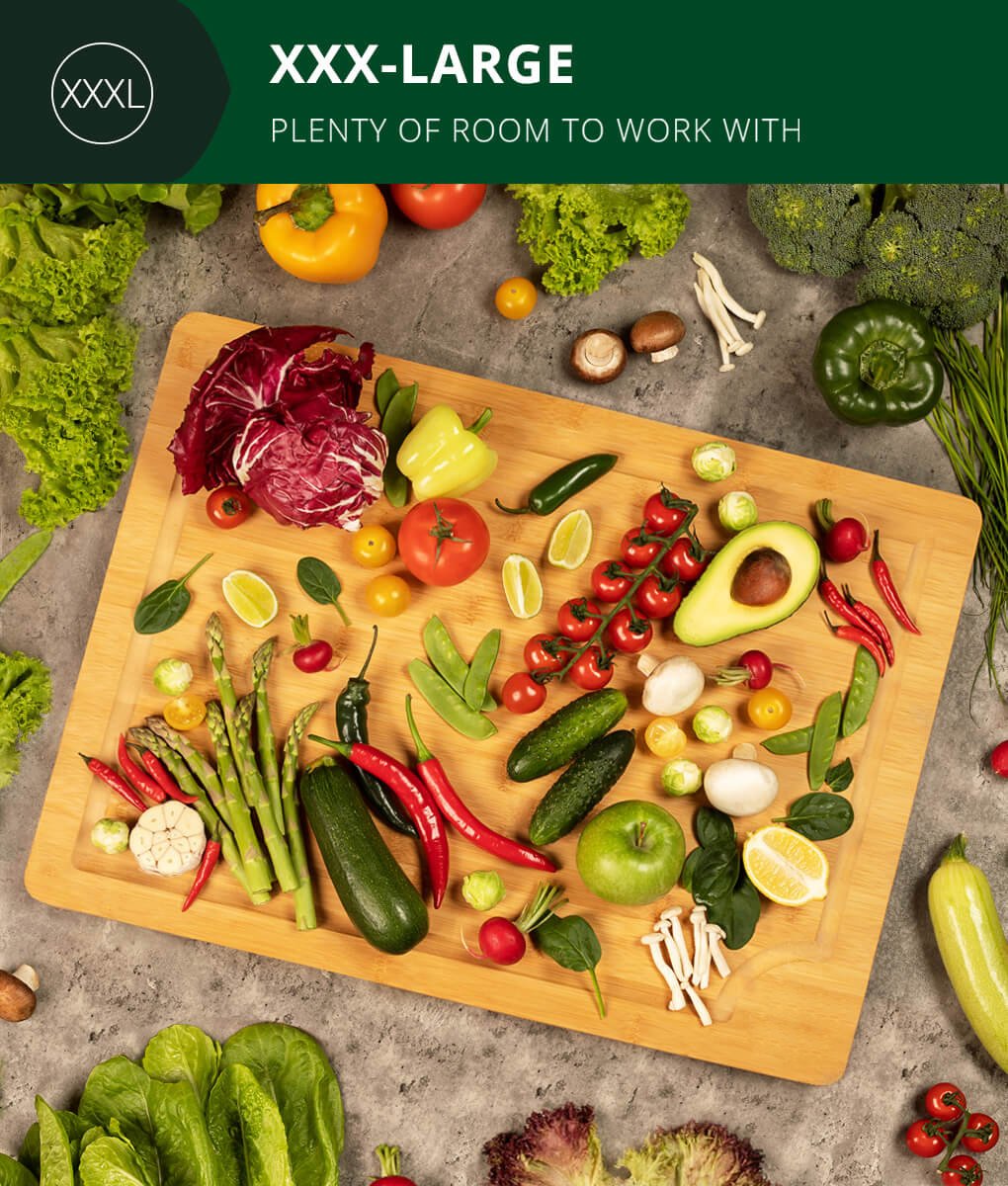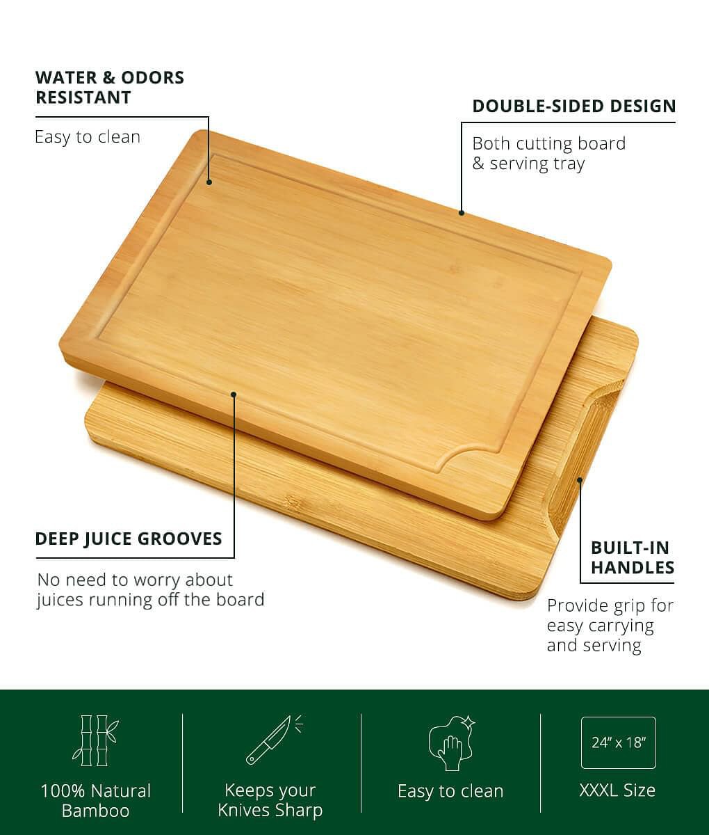 Its organic composition ensures you won't have to fret over your cutting board extra large harboring bacteria. It also serves as a neat kitchen countertop decor piece. Made to keep your knives in check and prevent sliding while you chop away.