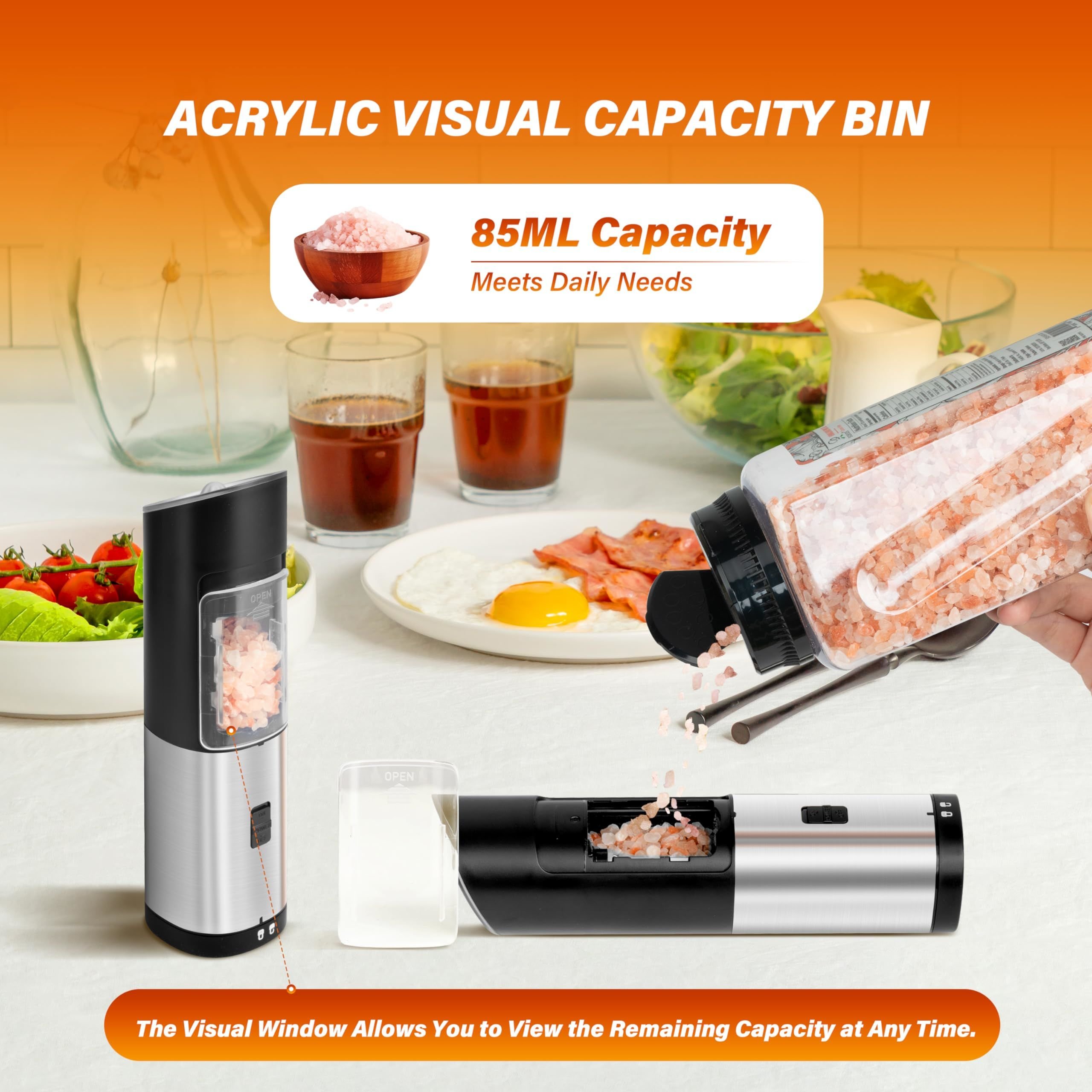 [Beautiful & Practical] Gravity electric salt and pepper grinder set battery operated with blue LED light, you can easily not only see amount of salt and pepper you put in your food, but aslo see the storage area clearly. Accurately season your food.