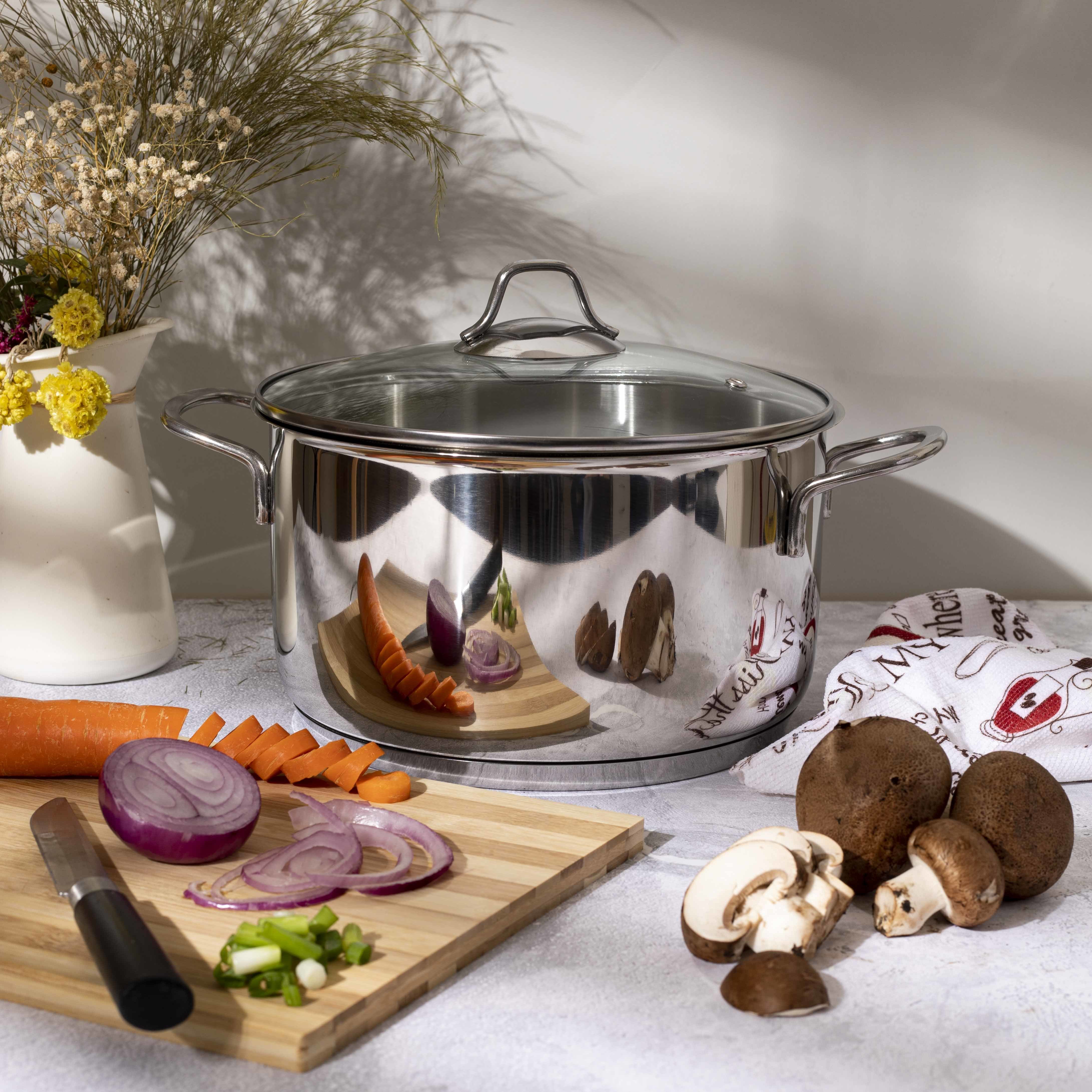 COOKING POT: This canning pot is 9.45 in/24 cm,152 oz/4.5 L. Tempered glass lids lock in true flavor, texture and nutrients for tender, succulent dishes while the body-extension steel handles offer a safe and secure hold. Safe for metal utensils.