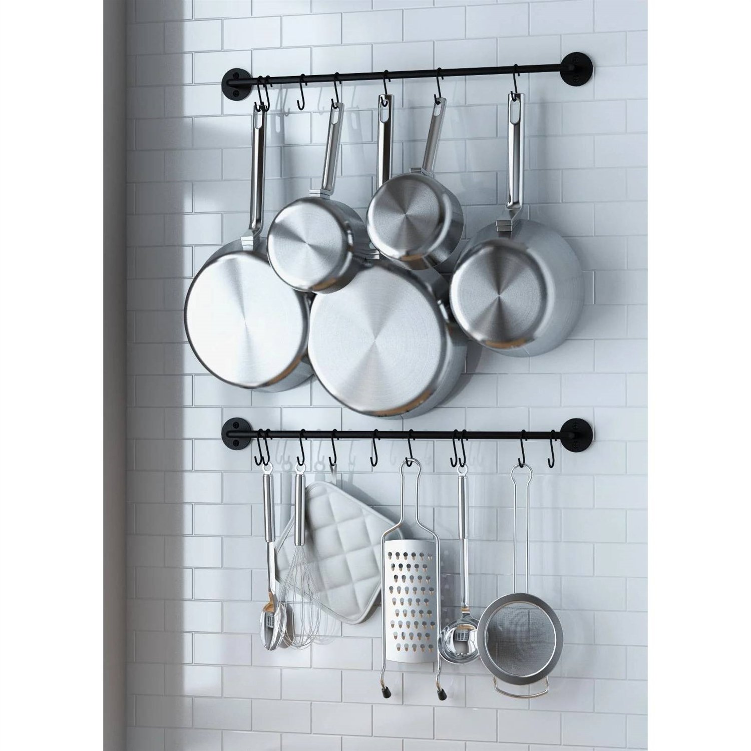 Enhance your kitchen decor with this Set of 2 - Black Metal Wall Mounted Pot Rack with 20 Hanging Hooks! Mount these kitchen racks to create professional kitchen wall decor while keeping your cooking supplies and other kitchen utensils where you can easily reach them. Our hanging pot and pan rack unit is ready to serve you for many years in your kitchen organization and storage.