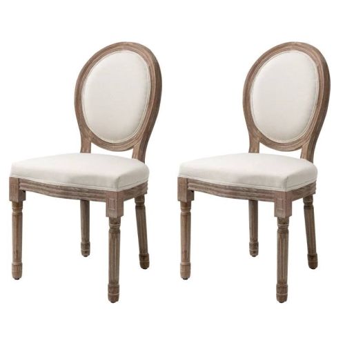These Chic French Style Set of 2 Vintage Upholstered Armless Curved Back Dining Chairs has an elegant and rustic style, gracefully curved back, classic color scheme, and beautifully carved leg patterns. These armless chairs have a rubberwood frame and legs, and linen fabric upholstery with a high-density sponge makes these modern dining chairs breathable and provides high comfort. The padded backrest supports your back and lumbar, while the armless design allows for multiple sitting options and freedom of movement while seated. These dining set chairs work great in your dining room, kitchen, or living room. The footpads on each leg ensure you won't scuff up your hardwood or tile floors and stay in place on the carpet.