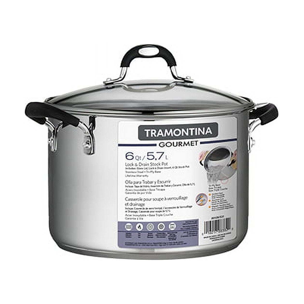 This 3-Piece, 6-Quart Tramontina Stockpot can be used with or without its locking strainer. The pot is made from stainless steel for a stylish look with durability and excellent heat conductivity. The tri-ply base layer produces consistent heating and is ideal for preparing pasta, vegetables, stock, sauces and more. The stainless-steel stockpot comes with a glass lid so you can easily check on your cooking progress. It also has ergonomically designed handles with a soft grip. These are riveted onto the pot for extra strength. The Lock-N-Drain covered stockpot features a stainless-steel strainer that can be locked onto the cooking pot to drain water from pasta or vegetables. It is attractive, versatile and functional, so you can enjoy using it with or without the unique strainer. This 3-Piece 6-Quart Tramontina Stockpot is ideal for the serious cook or homemaker.