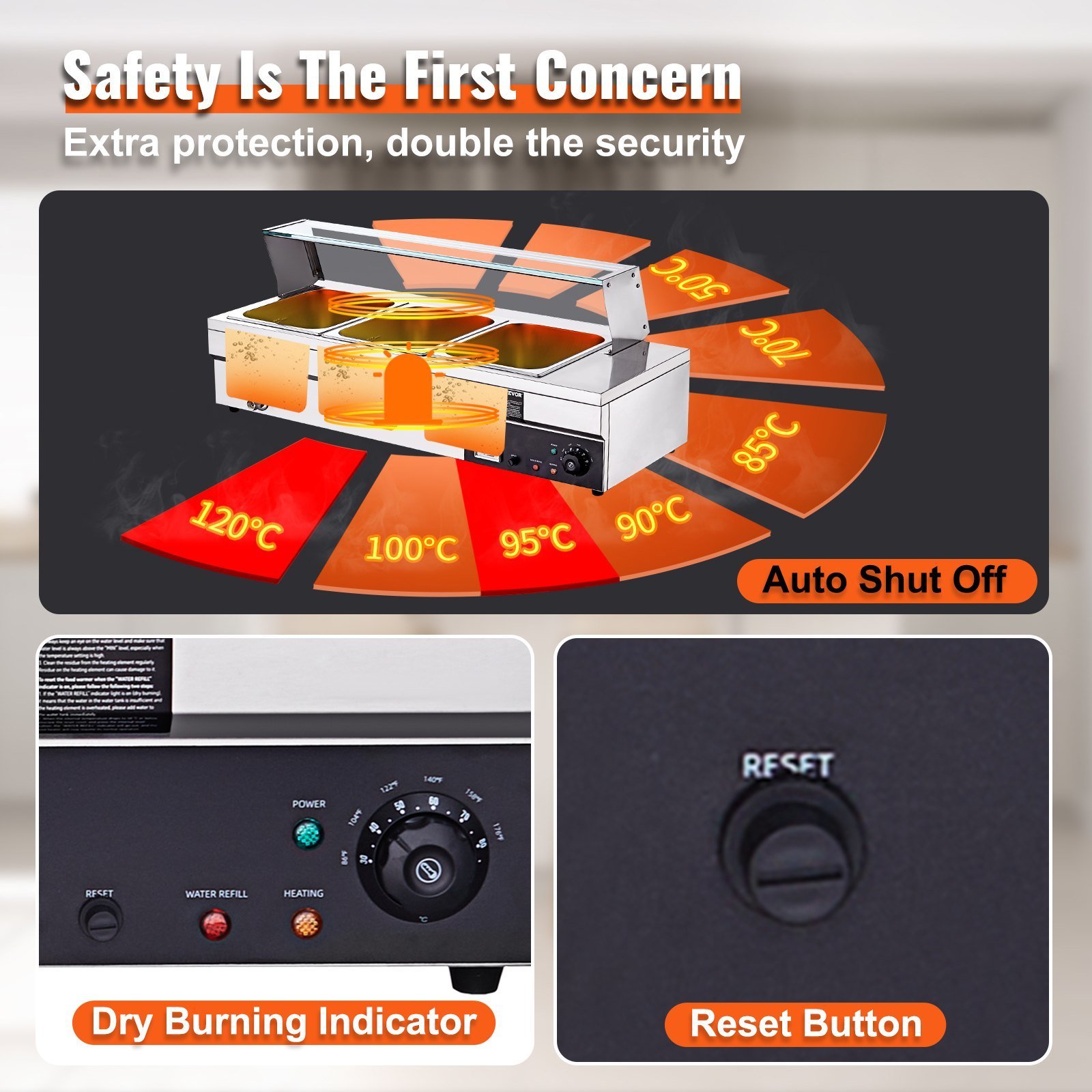 3.Additional Security: We have upgraded our food warmer with newly designed "Dry Burning Indicator" and "Reset Button". The dry-burning indicator function automatically stops heating the food when the temperature exceeds 248°F (120°C). To resume operations, simply refill the water and press the Reset Button.