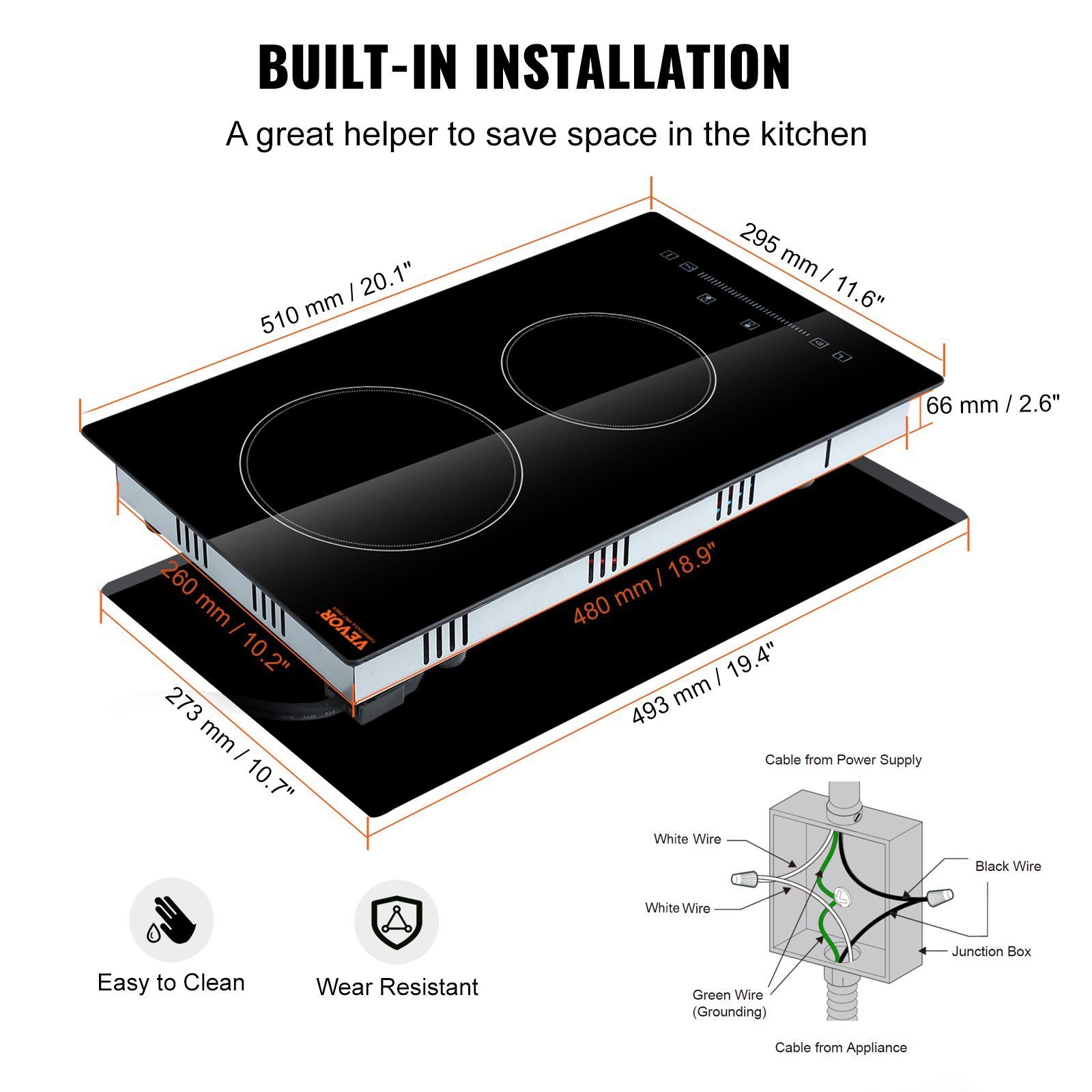 The cutout size of our electric cooktop is 10.7x19.4 inches. With the built-in design, it is effortless for you to install this cooktop into your kitchen, and it also saves a lot of your cooking space.