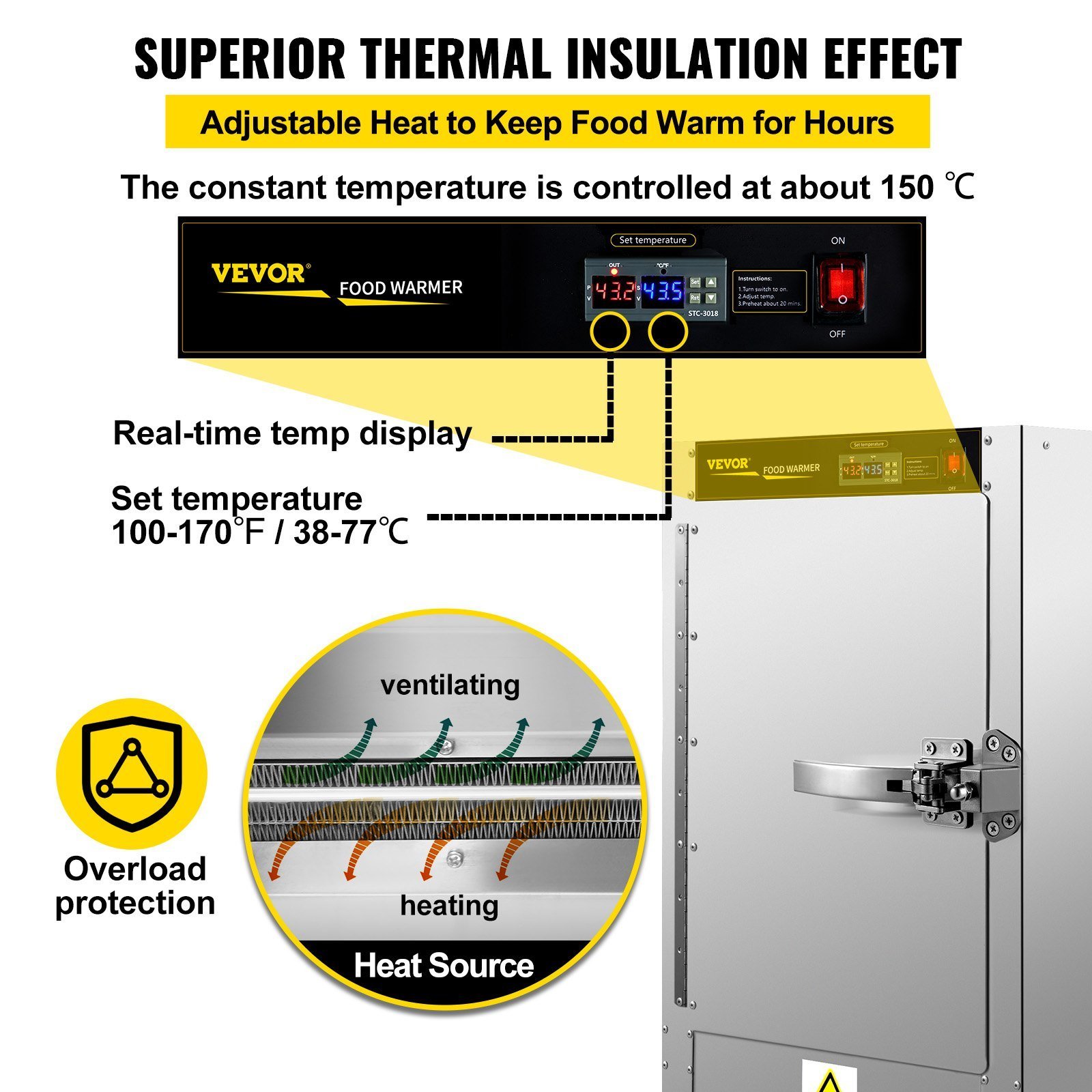 Temperature control for adjusting heating temperature from 100 to 170°F; thermostatic mode keeps the food at 150°F constantly and the internal PTC heat source can avoid over-heating, perfect for commercial catering use.