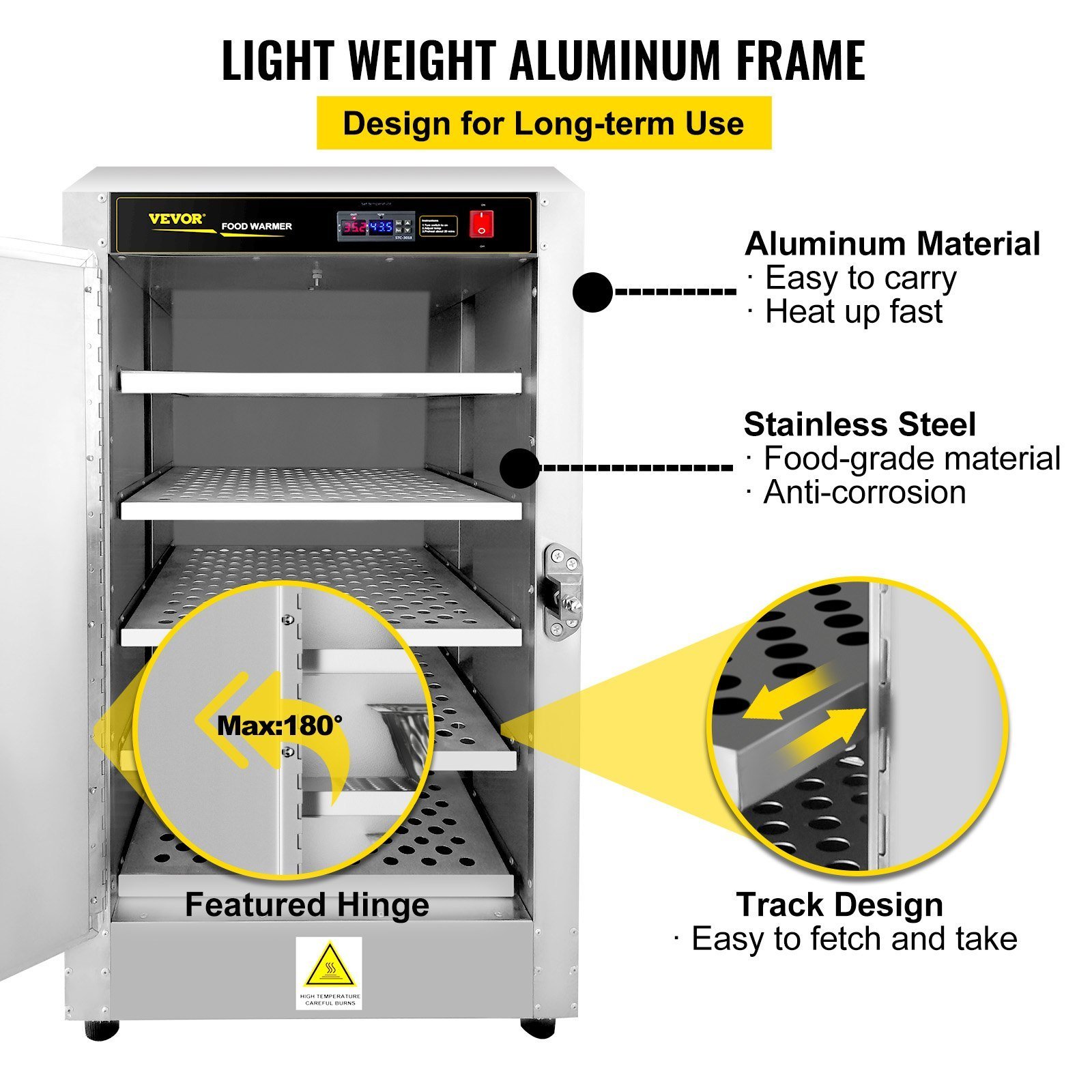 2.High-quality Aluminum Construction: Constructed of non-corrosive aluminum, this food warmer can hold prepared foods at proper serving temperatures for extended periods of time. The lightweight frame on this warmer allows for easy mobility. The trays are made of stainless steel and is very easy to pull, the door hinge allows you to open the door at a maximum angle of 180°.