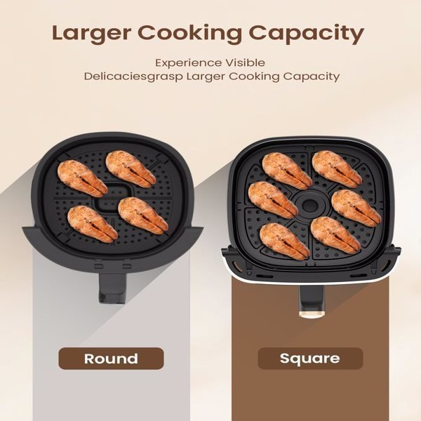 • [Large Visual Window] The air fryer with visual window allows you to grasp the food cooking process and effect without opening the airfryer every time, increasing your cooking pleasure and achievement. In addition, it can also avoid some safety hazards, such as food burning or overcooking.